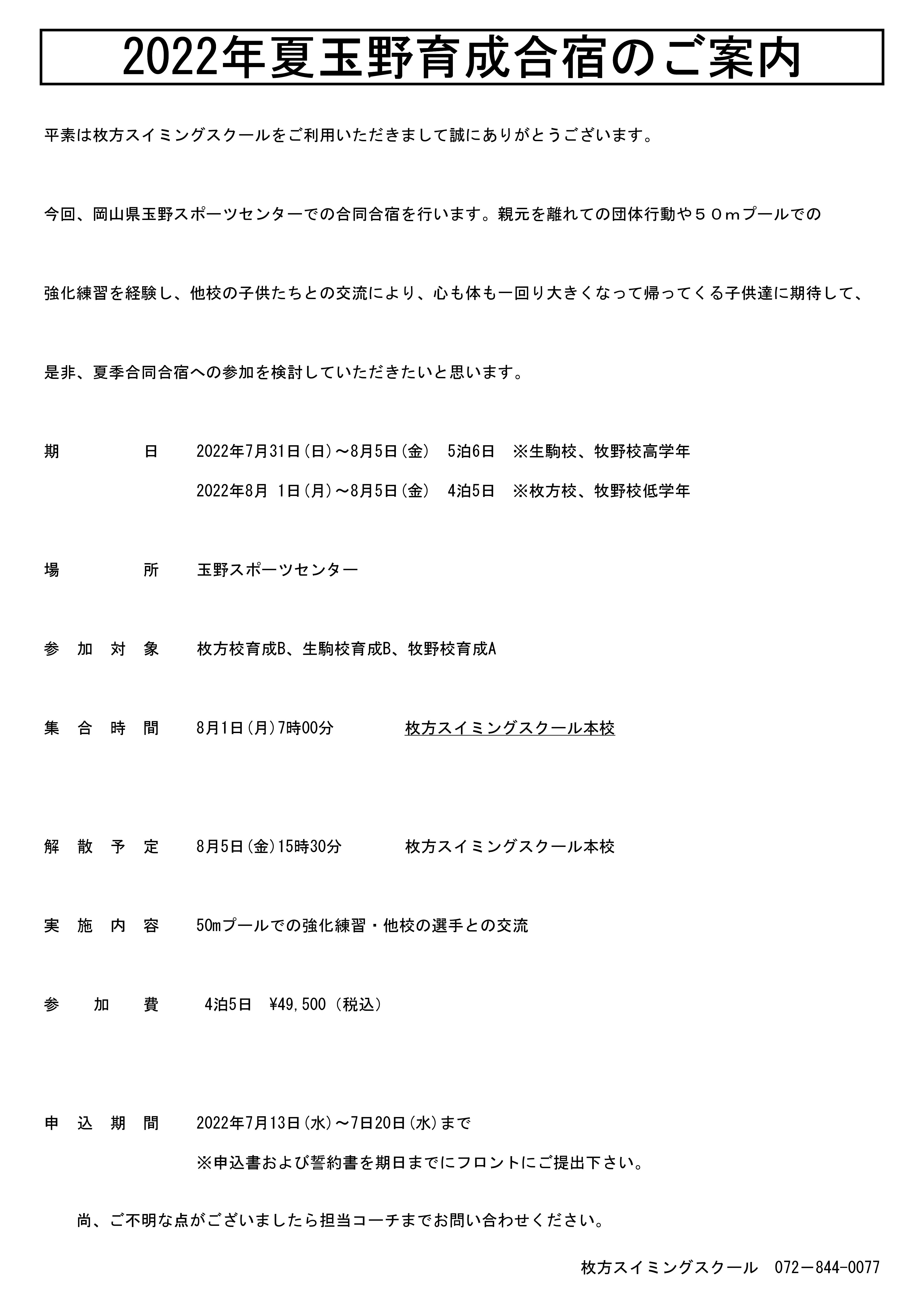 帰り:バス富山発・14:30~20:30枚方着予定 枚方スイミングスクール
