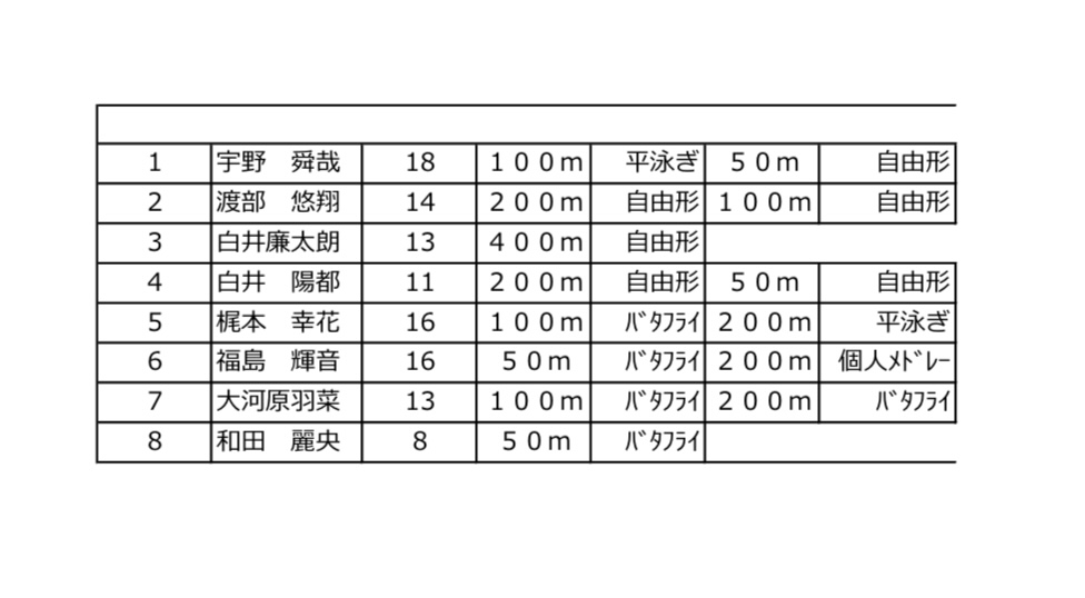 1月13日・14日に開催予定の和歌山県短水路選手権水泳競技大会のエントリー確認になります。