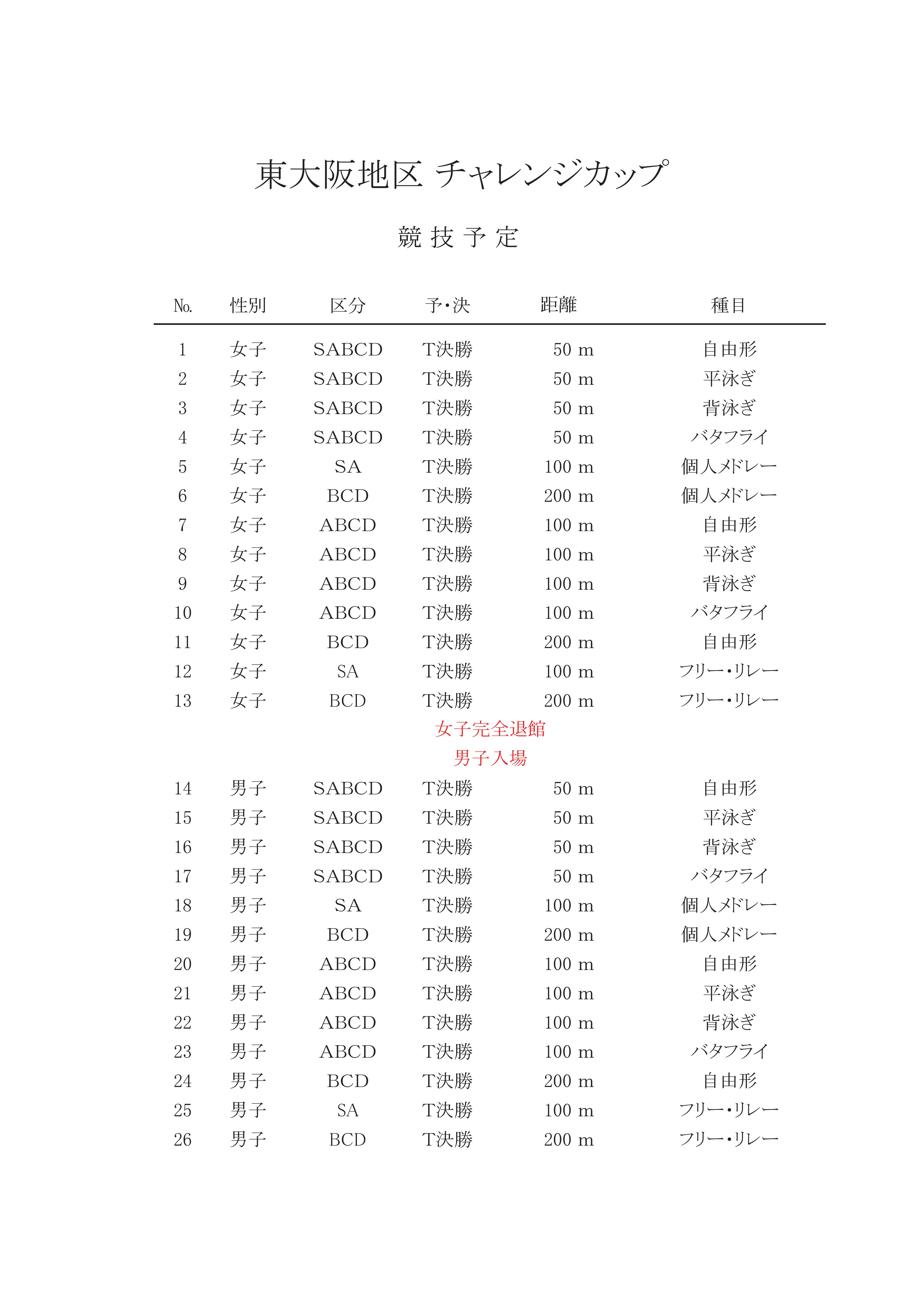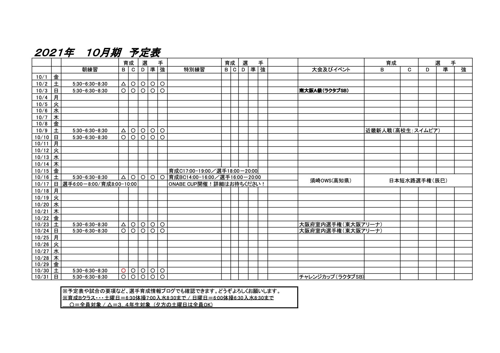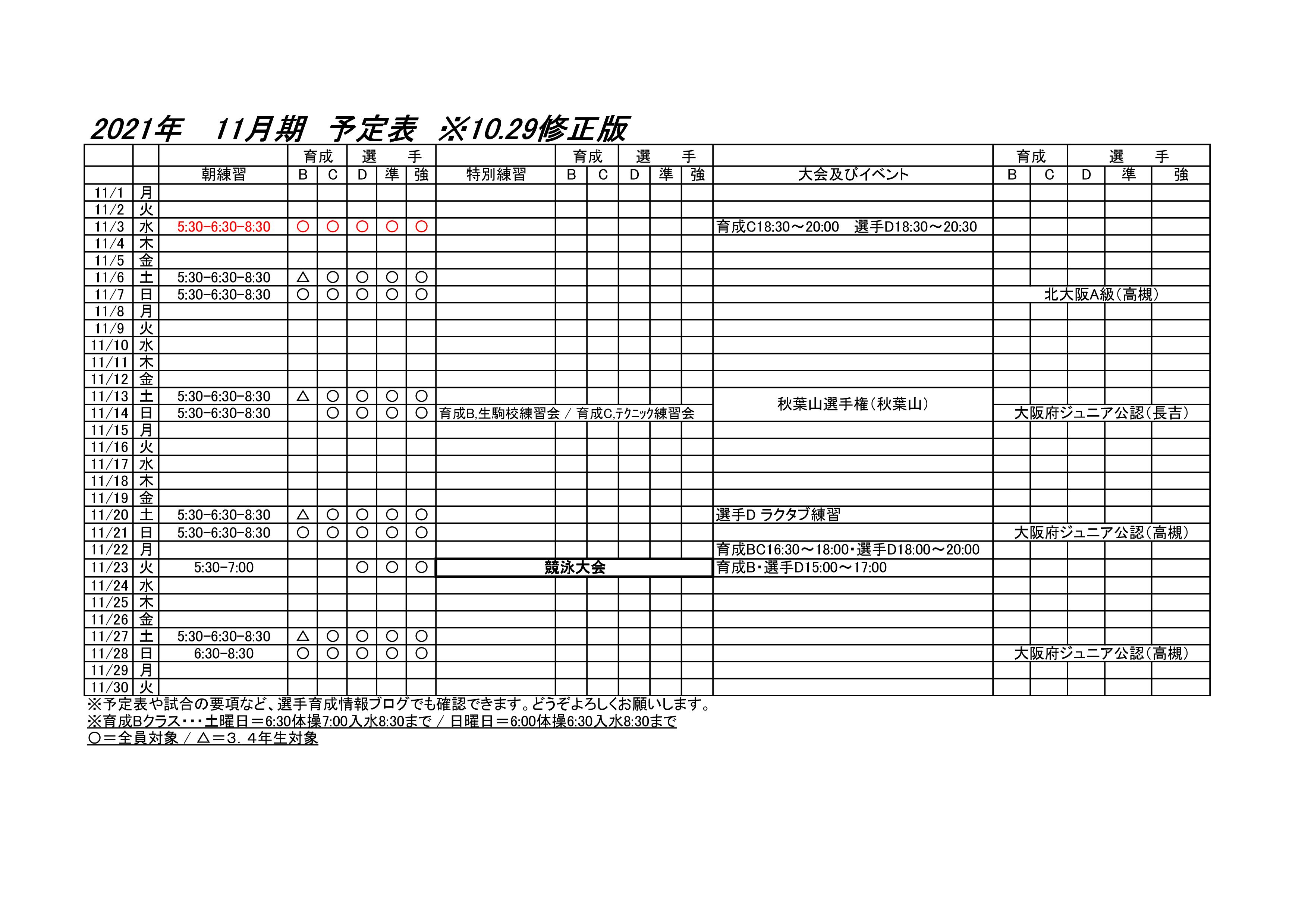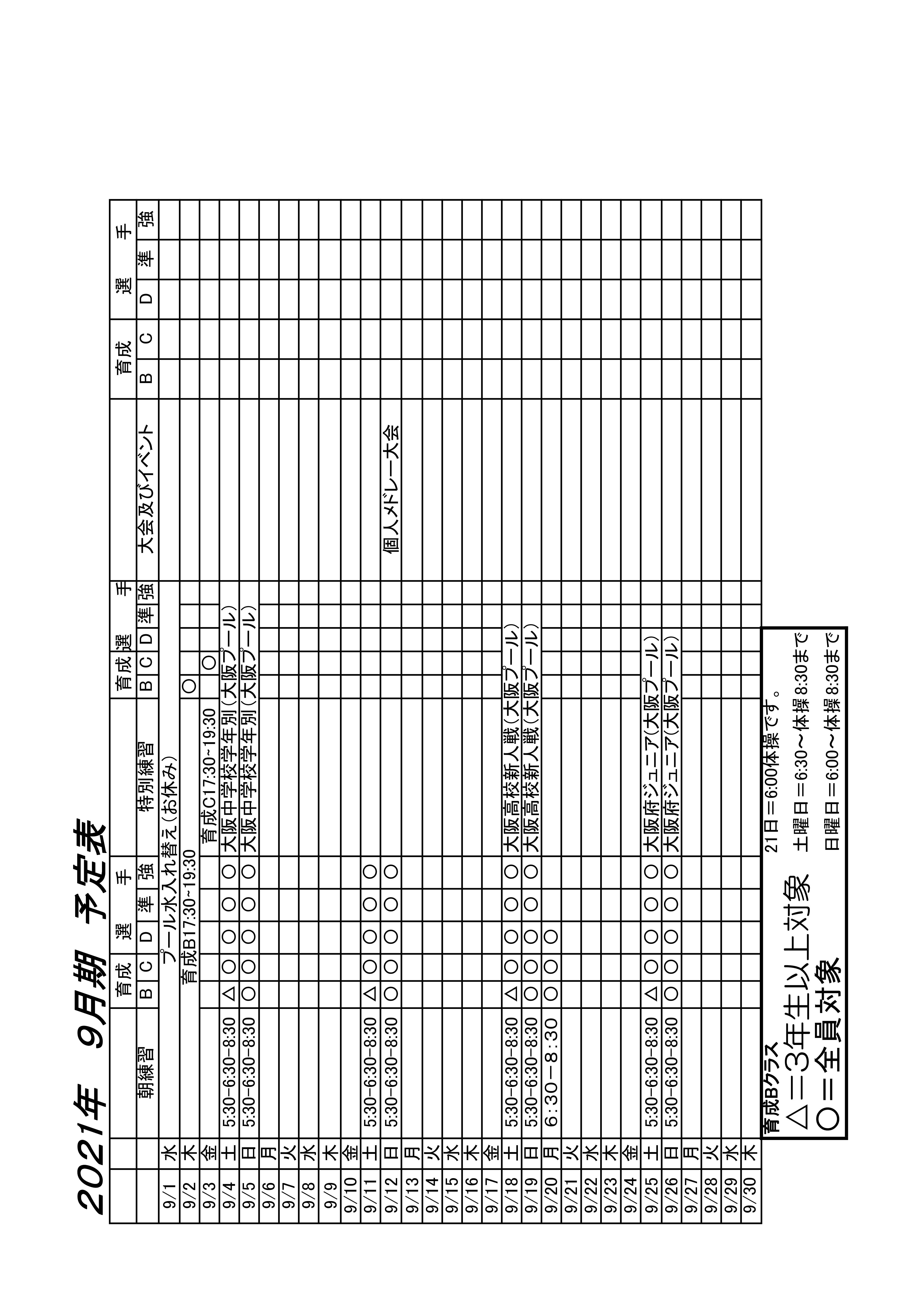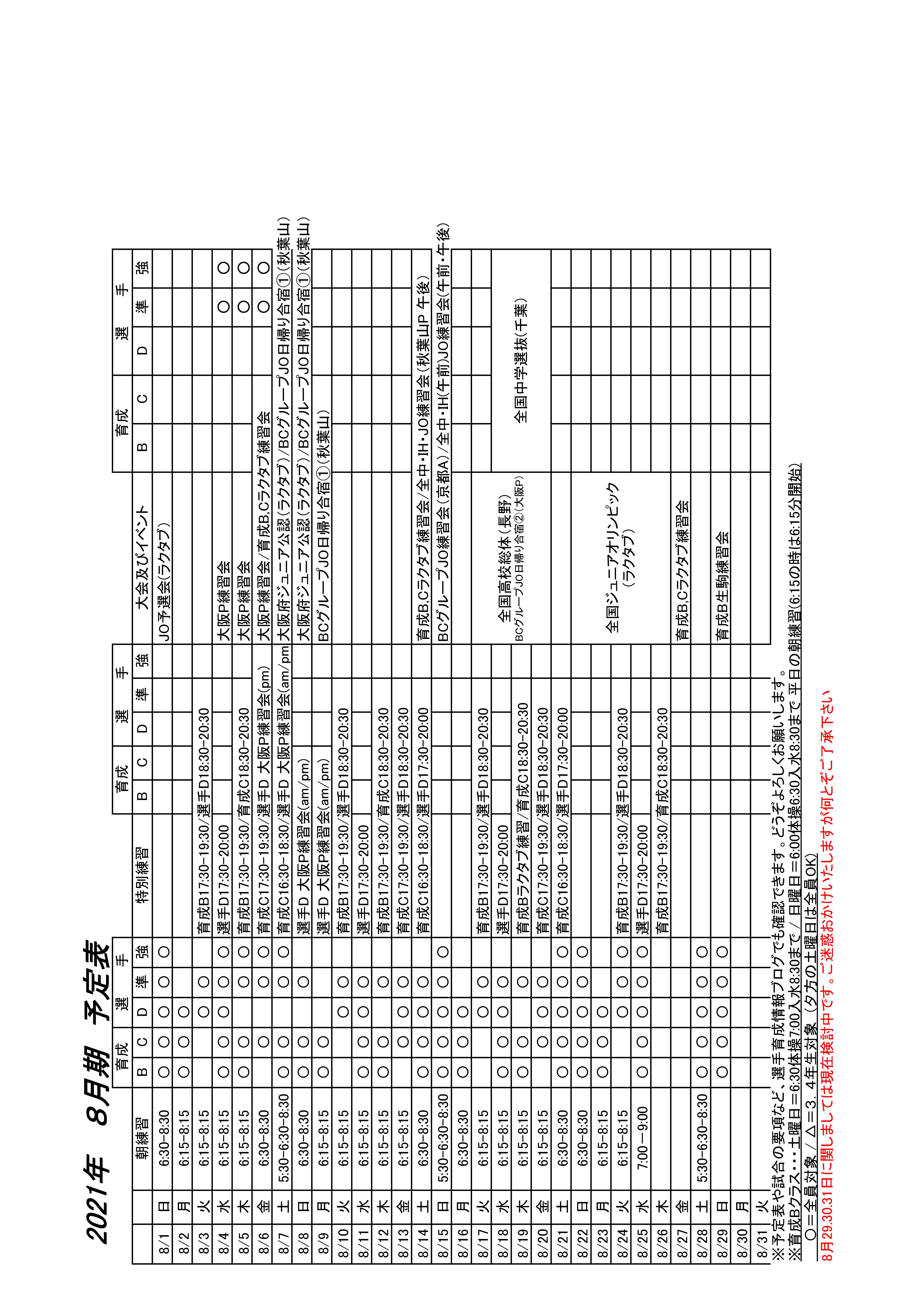 育成B 11日は予定表通りです。12日は女子は6:00〜7:00(体操なし)、男子7:00体操〜8:30